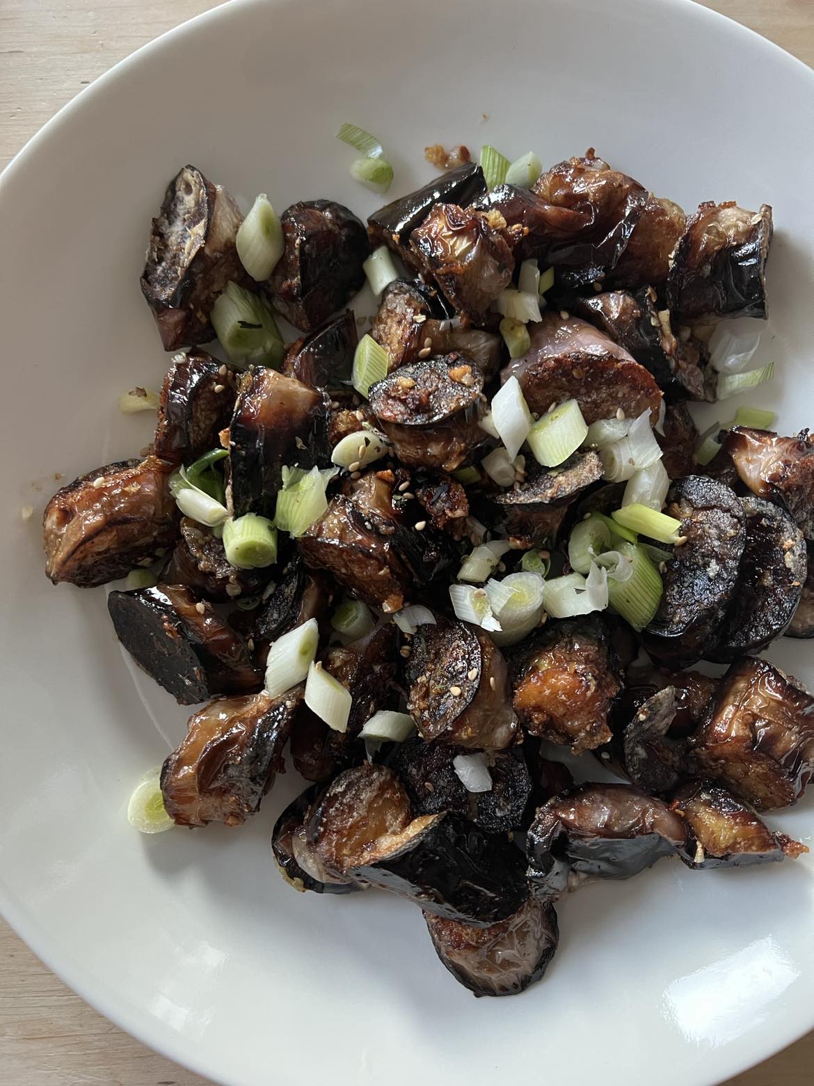 Pane baklažaan uuesti pannile. Lisa sojakaste, sega ja prae minut aega.