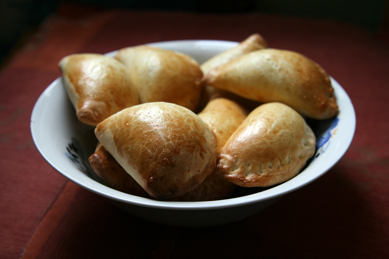 Rulli tainas 5 mm paksuselt üsna jahusele lauale ja lõika 7-10 cm klaasiga ümmargused kettad. Aseta ketta ühele poolele kuhjaga tee- või supilusikatäis täidist, murra teine tainapool peale. Suru soovi korral poolkuu servad tugevasti kinni. Määri pealt veega segatud munakollasega.