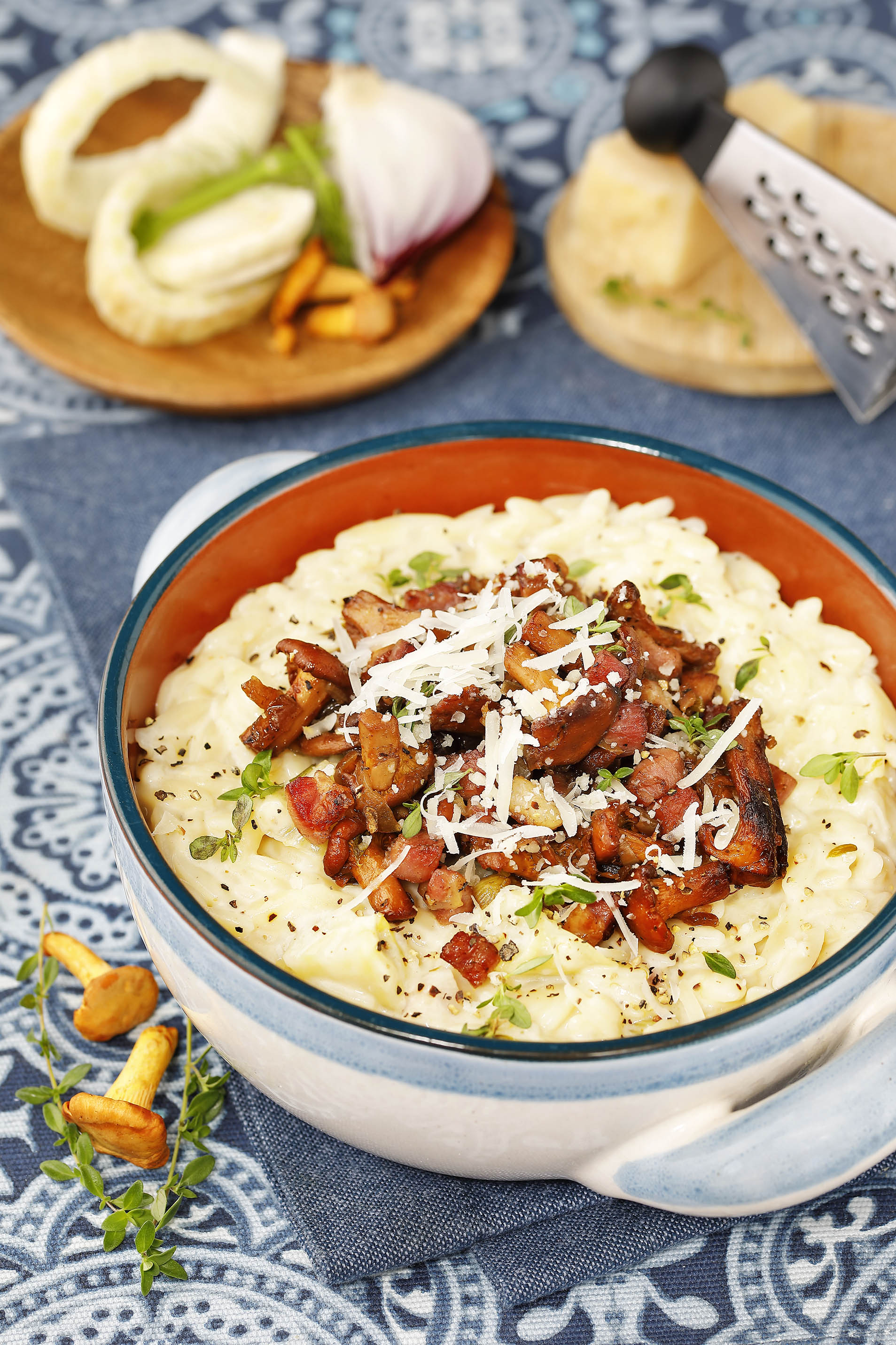 Orzo on riisiterakujuline makaron/pasta, mida armastatakse Vahemeremaades. Siin kohtuvad need koos kukeseentega risoto-laadses roas.