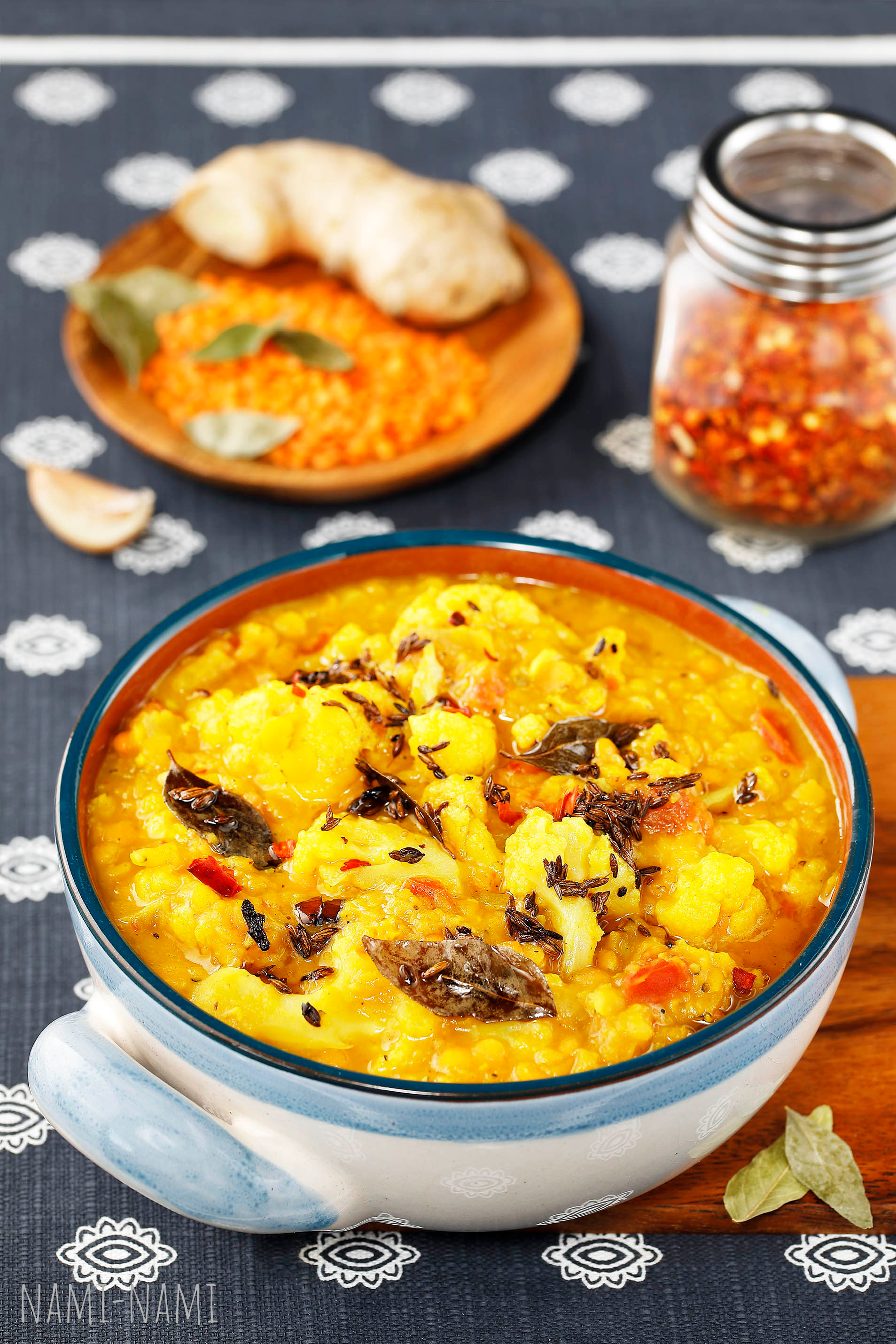 Kuumuta ülejäänud 1 sl õli väikesel praepannil. Lisa vürtsköömned, tšillihelbed ja karrilehed ja kuumuta 1-2 minutit, kuni seemned praksuma hakkavad. Kalla saadud vürtsiõli läätse-lillkapsasegule.