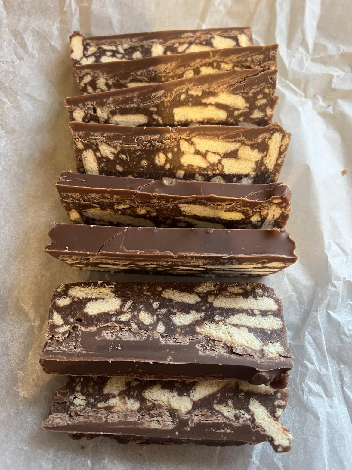 Katte jaoks pane piimašokolaad ja lusikatäis õli vesivanni ning sulata ühtlaseks. Nirista sulašokolaad küpsisekoogile. Silu pealt ühtlaseks, siis pane umbes 3 tunniks külmkappi tahenema.