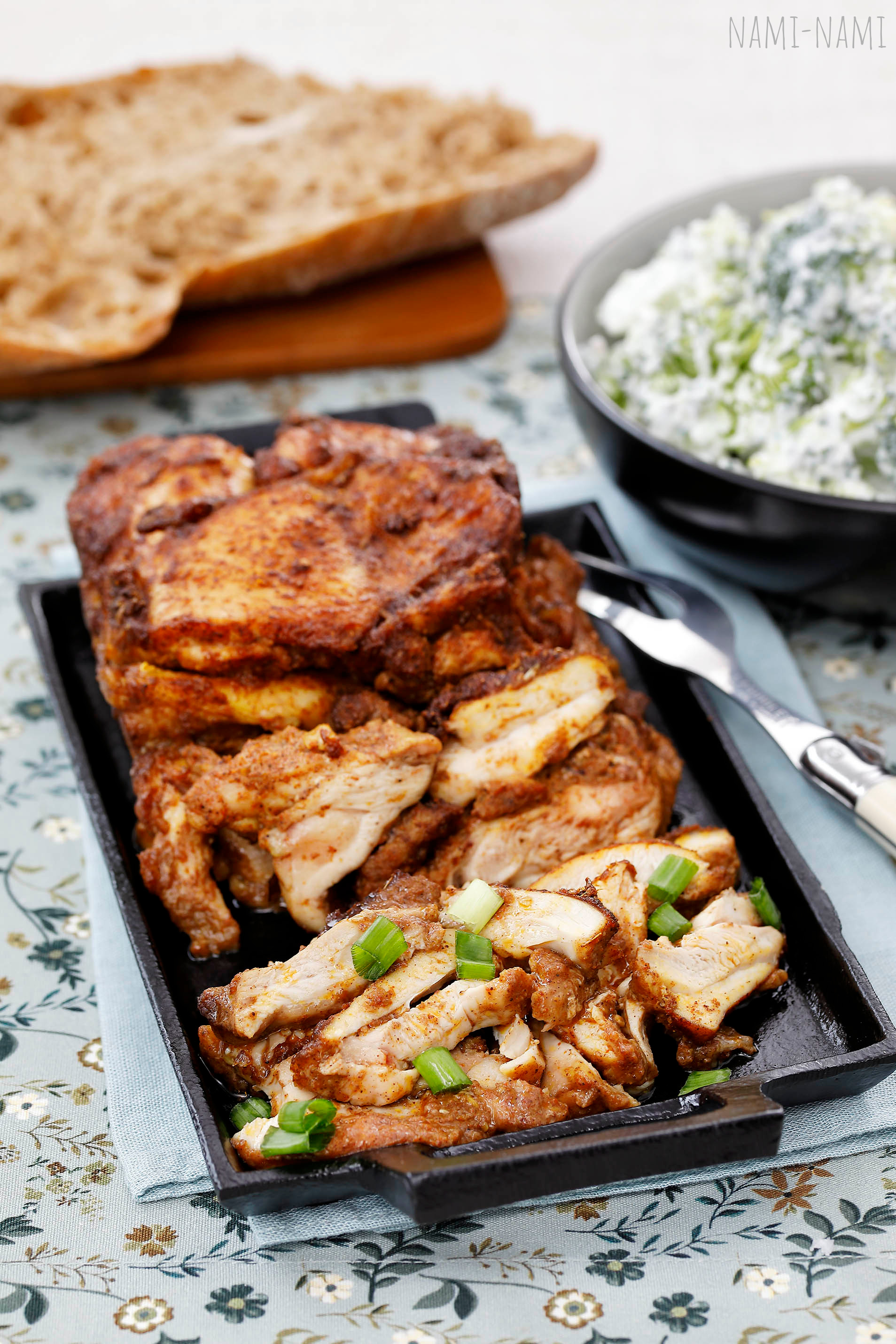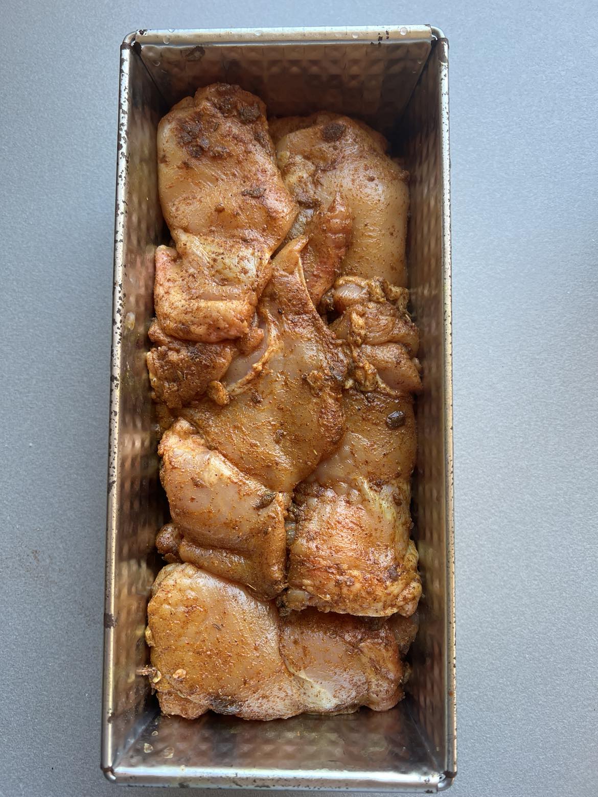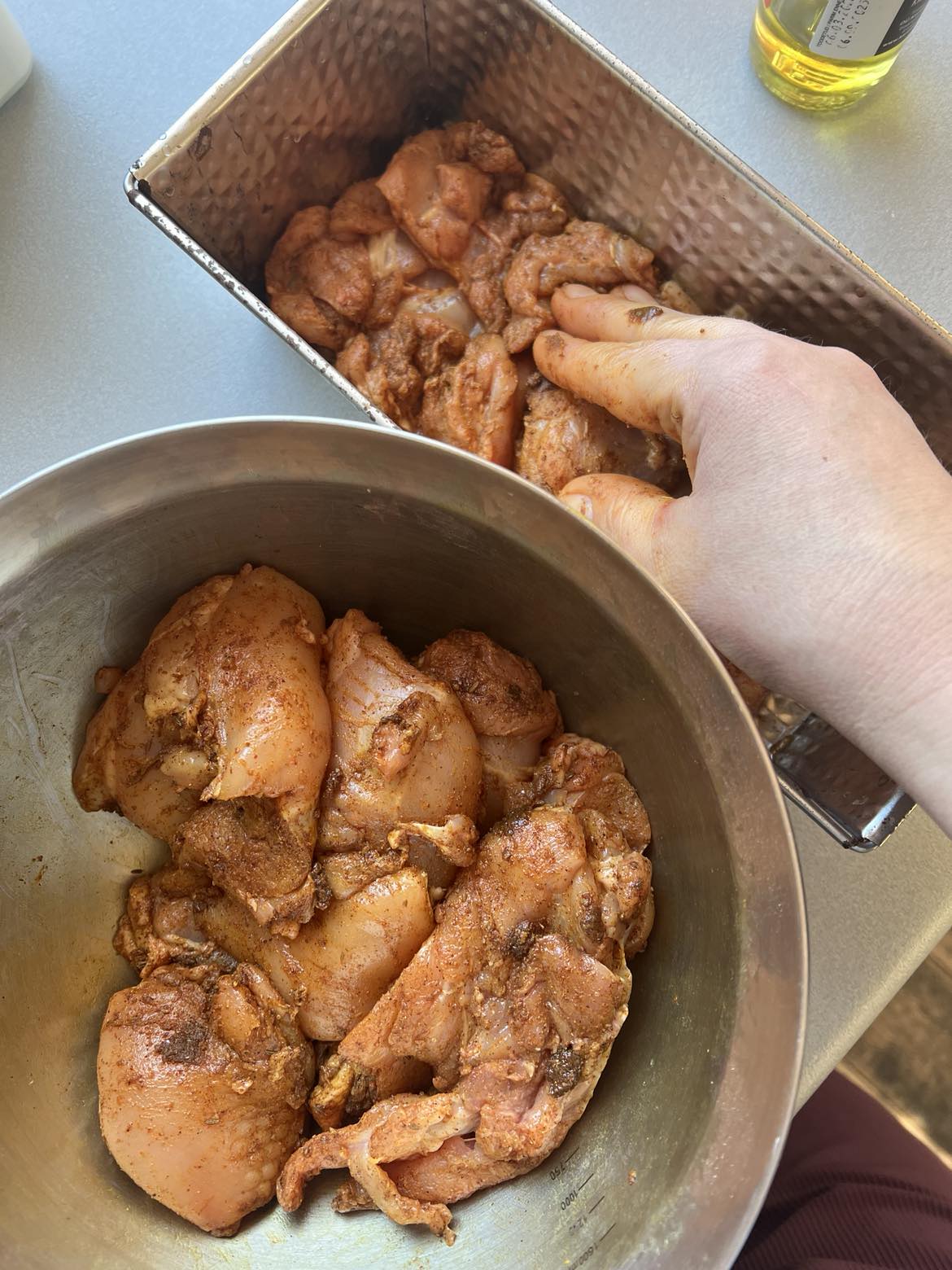 Lõika kanakintsulihatükid pooleks, pane kaussi. Sega juurde õli, siis puista peale vürtsisegu. Sega hoolega läbi.