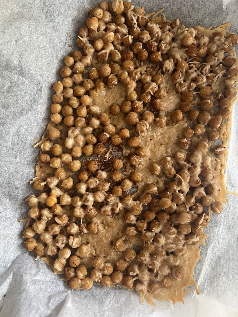 Nõruta kikerherned, loputa ja nõruta uuesti hoolega, siis patsuta köögipaberiga kuivemaks. Puista äärega väiksemale ahjupannile, nirista peale oliiviõli. Siis küpseta umbes 15 minutit või kuni kikerherned muutuvad krõbedaks.