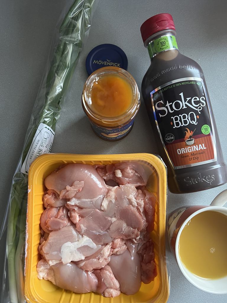 Samal ajal sega kausis mango-virsikumoos, BBQ-kaste, ananassimahl, küüslauk, sibul, sojakaste ja umbes 1 tl värskelt jahvatatud musta pipart.