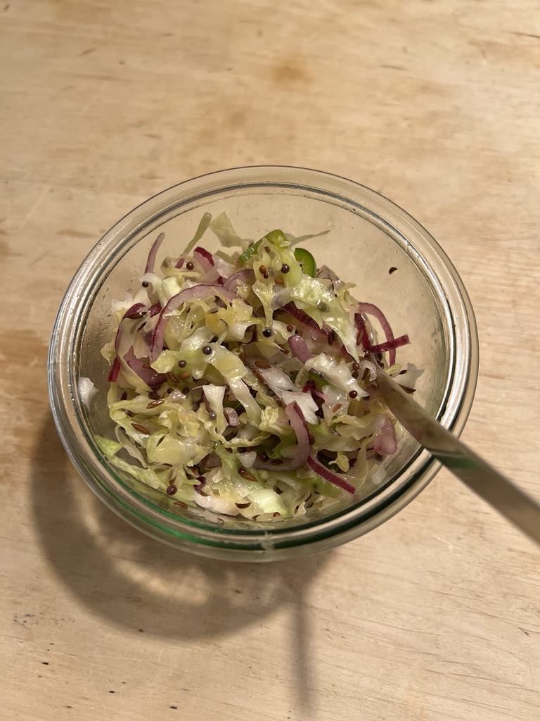 Lõika kapsas terava noaga või köögimandoliiniga peenikesteks ribadeks. Pane kaussi.