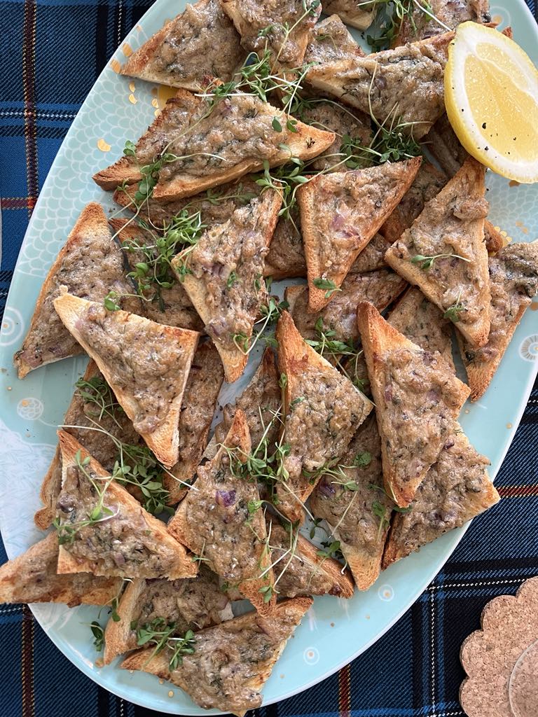 Tillukesed röstsaiakolmnurgad maitseküllase kattega. Kõrvale paku sidruniviile ja peale võid puistata veel peterselli.