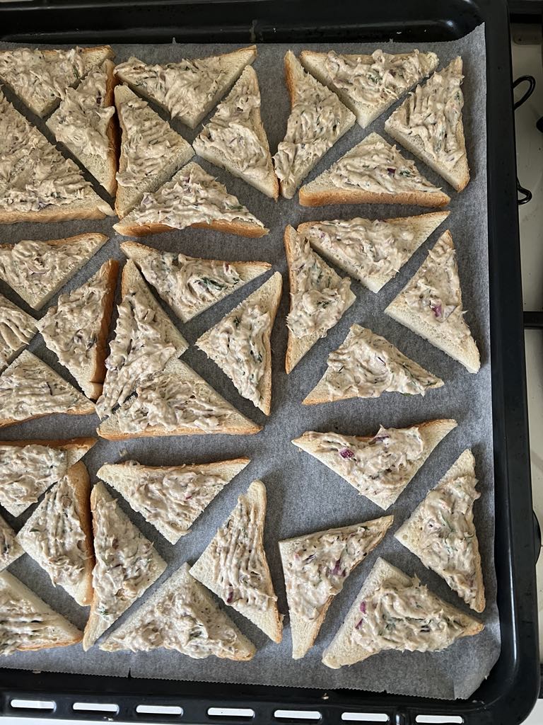 Ma saiaviiludelt koorikuid ära ei võtnud (ei toiduraiskamisele!) ja lõikasin saiaviilud neljaks. Tegin veidi vähem - täidise jagasin 9 saiaviilu ehk 4x9 ehk siis 36 saiaampsu vahel. Kui sardiine üle või soov sardiinidest miskit teha, siis kindlasti.