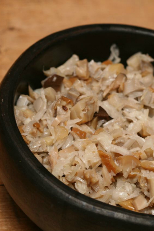 Lõika seened tükkideks, sega hapukapsa ja taimeõliga. Maitsesta suhkru, soola ja pipraga.