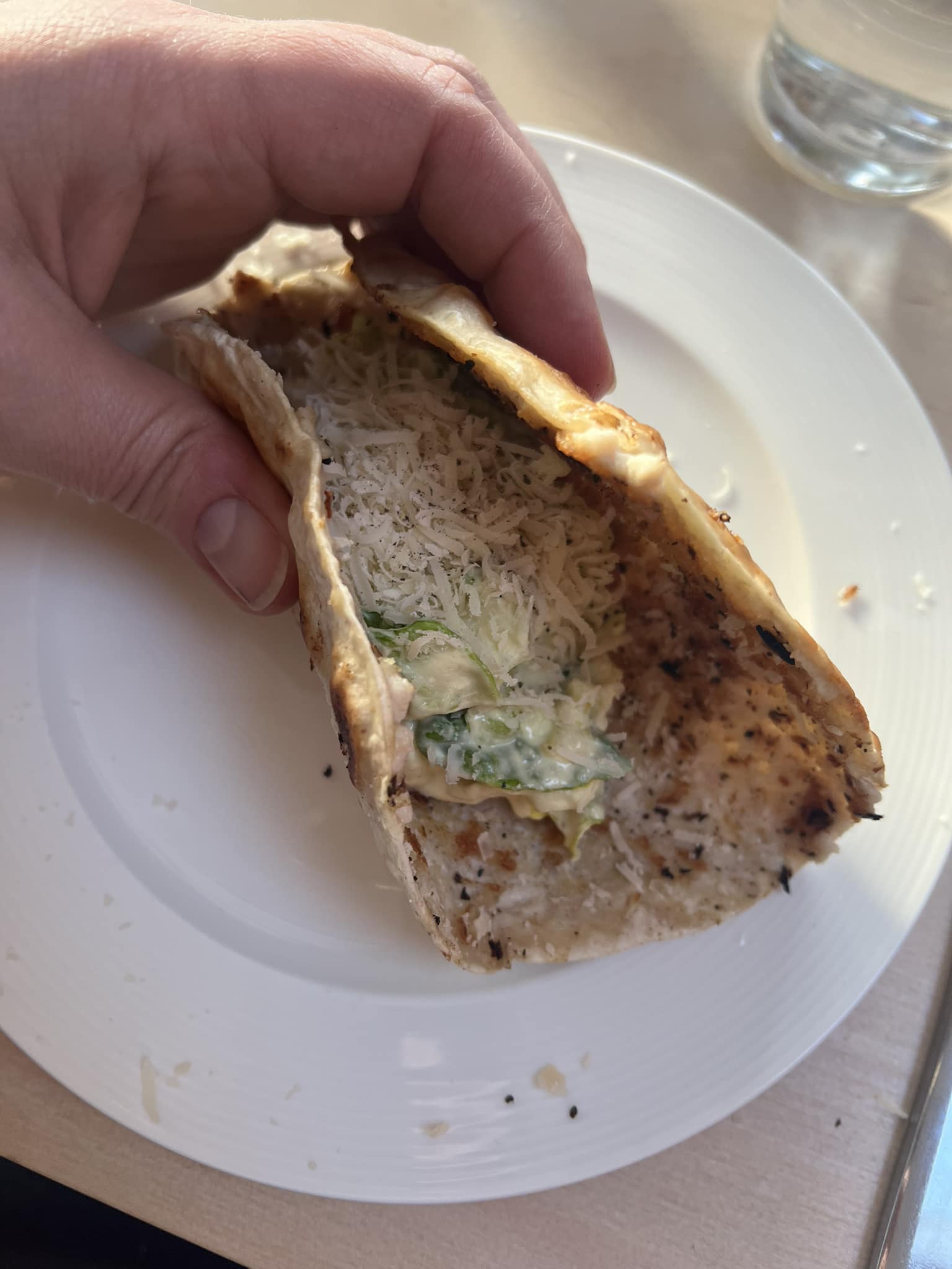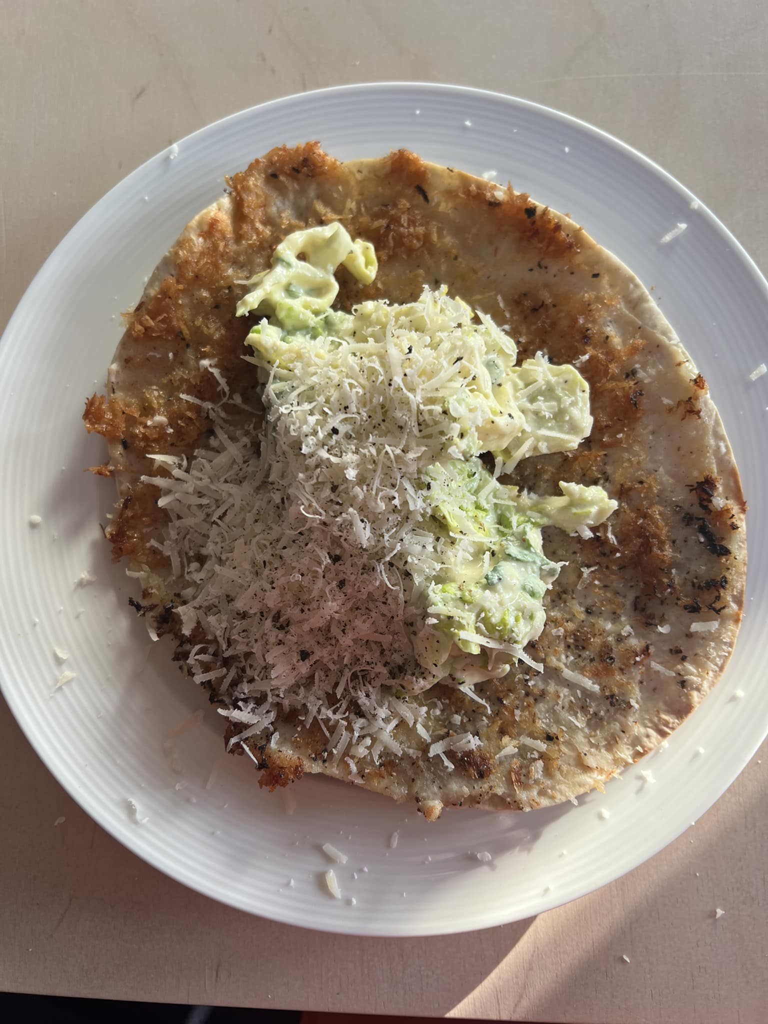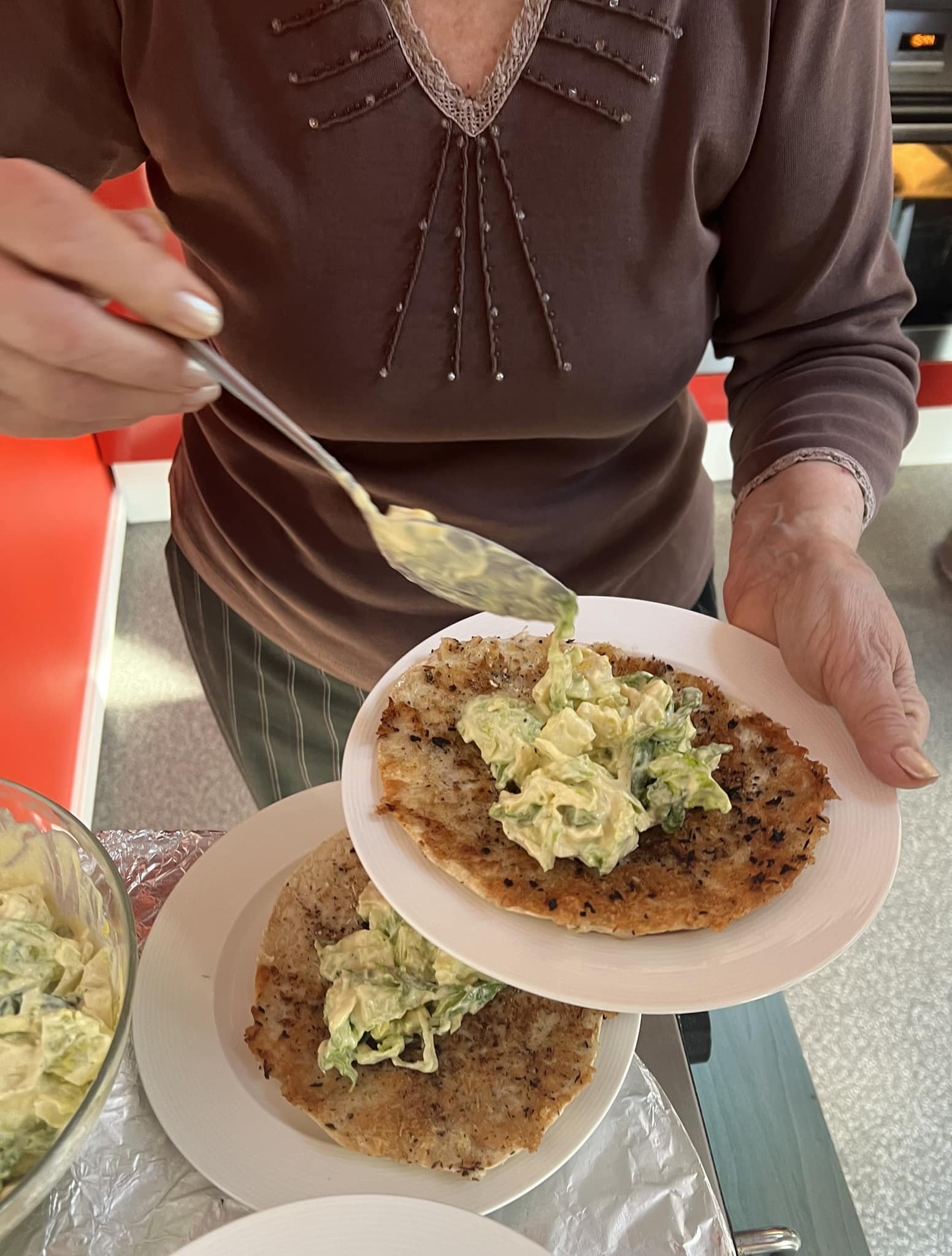 Enne serveerimist tõsta soojale tortiljale salatit ja puista peale riivitud juustu. Soovi korral nirista peale ka veidi Sriracha tšillikastet.