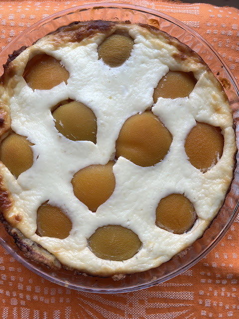 Aprikoosid asendasin virsikutega. Küpsetusaeg oli lõpuks selline : 35 min 175 kraadi, kuna täidis tundus liiga vedel, panin 200 kraadini ja 10 min. Kuna ka sellest ei piisanud lasin 175 kraadi juures veel 10 min ja lõpuks oli kook valmis :) Kook ise on suurepärane kui võtta lõik koos virsiku tükiga, siis ta on hästi mahlane. Kasutasin 26 läbimõõduga lahtikäivat vormi.