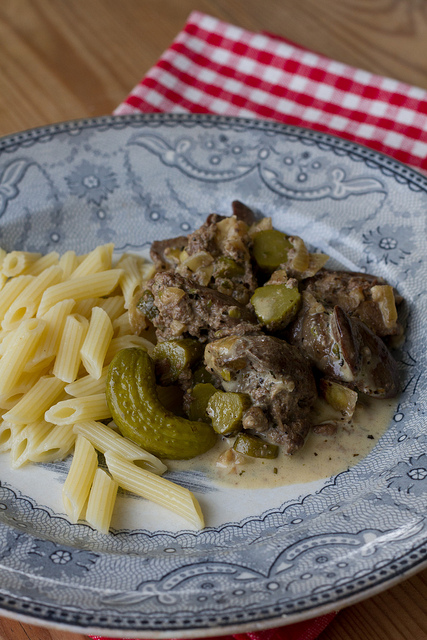 Marineeritud või hapukurgiga maitsestatud kanamaksakaste sobib hästi keedetud makaronide lisandiks.