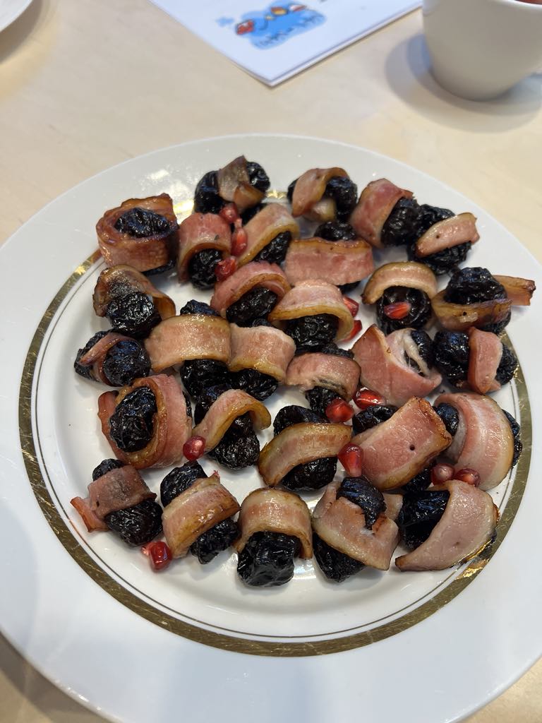 See lihtne kuum suupiste pole kellelegi uudiseks, aga rosmariinioks teeb selle kohe palju jõulusemaks ja meeleolukamaks. Muide, peekonisse keeratud ploom on brittide jõululaual üsna levinud ning seda kutsutakse kuradiks hobuse seljas (ingl. k. devils on horseback).