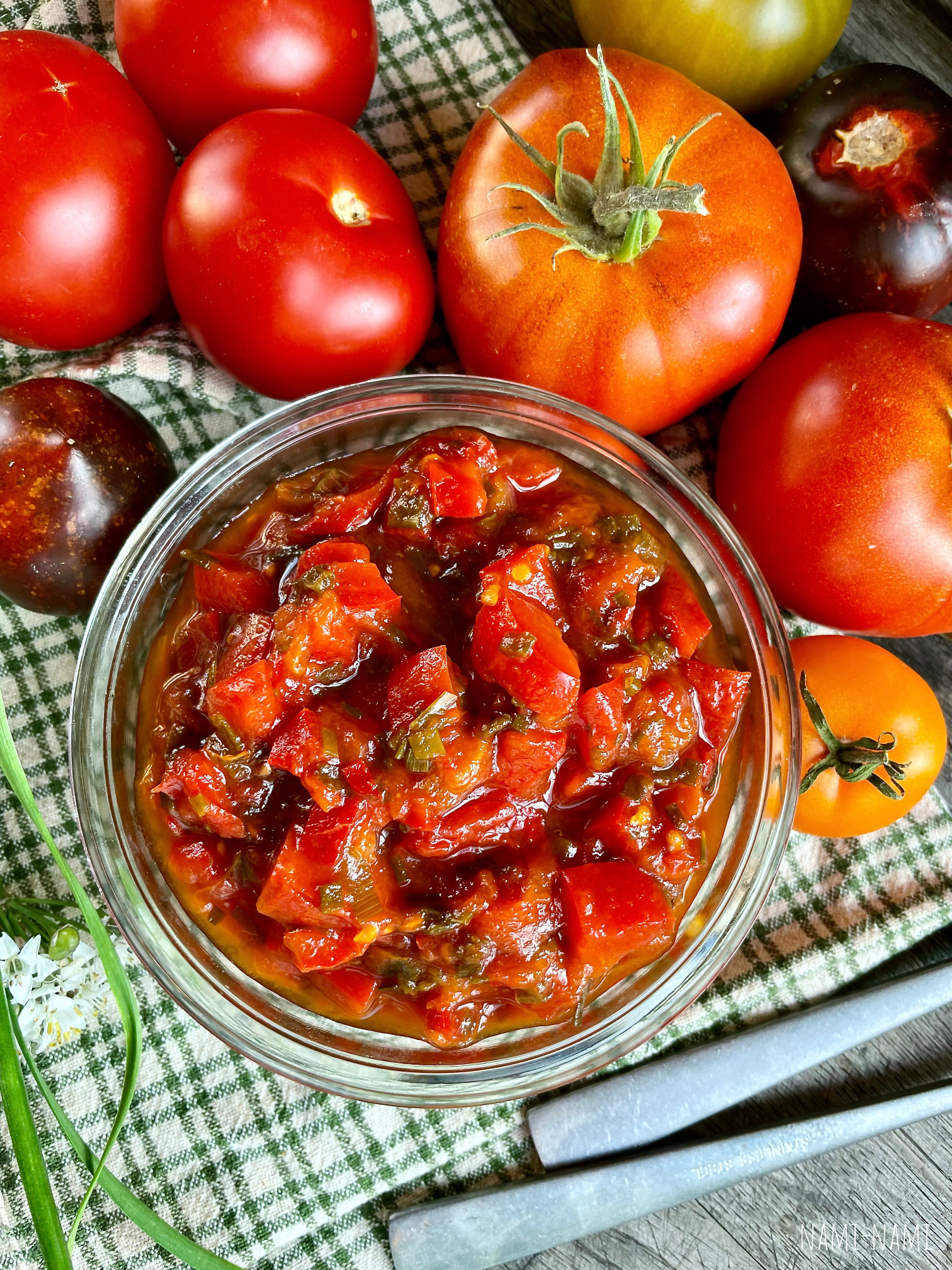Puhasta ja tükelda paprikad ja tšilli. Kasta tomatid mõneks minutiks keevasse vette ja koori. Haki murulauk.
