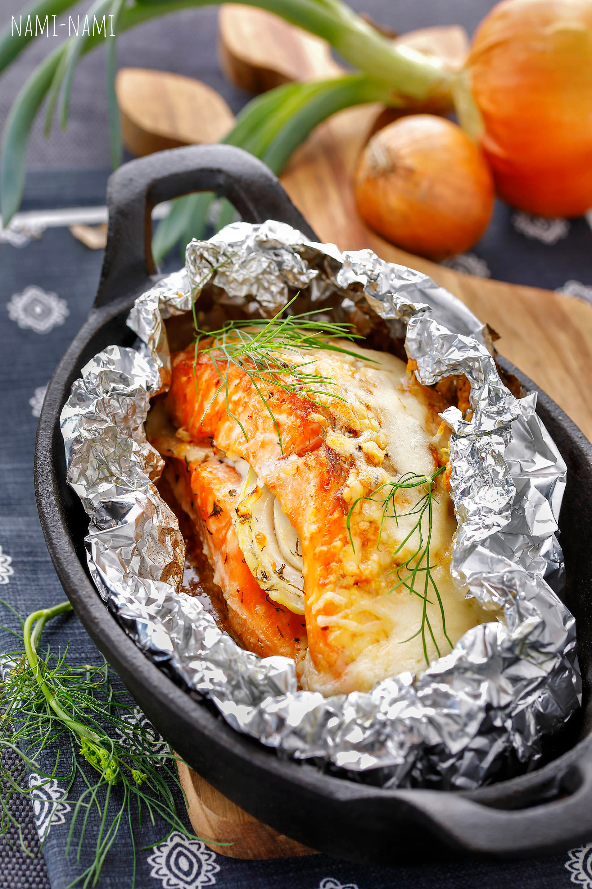 Maitsesta kala soola ja sidrunpipraga ning pane üks fileetükk õliga määritud fooliumile. Aseta peale sibularattad ja puista need üle hakitud tilliga. Ka veidi juustu võid peale riputada.