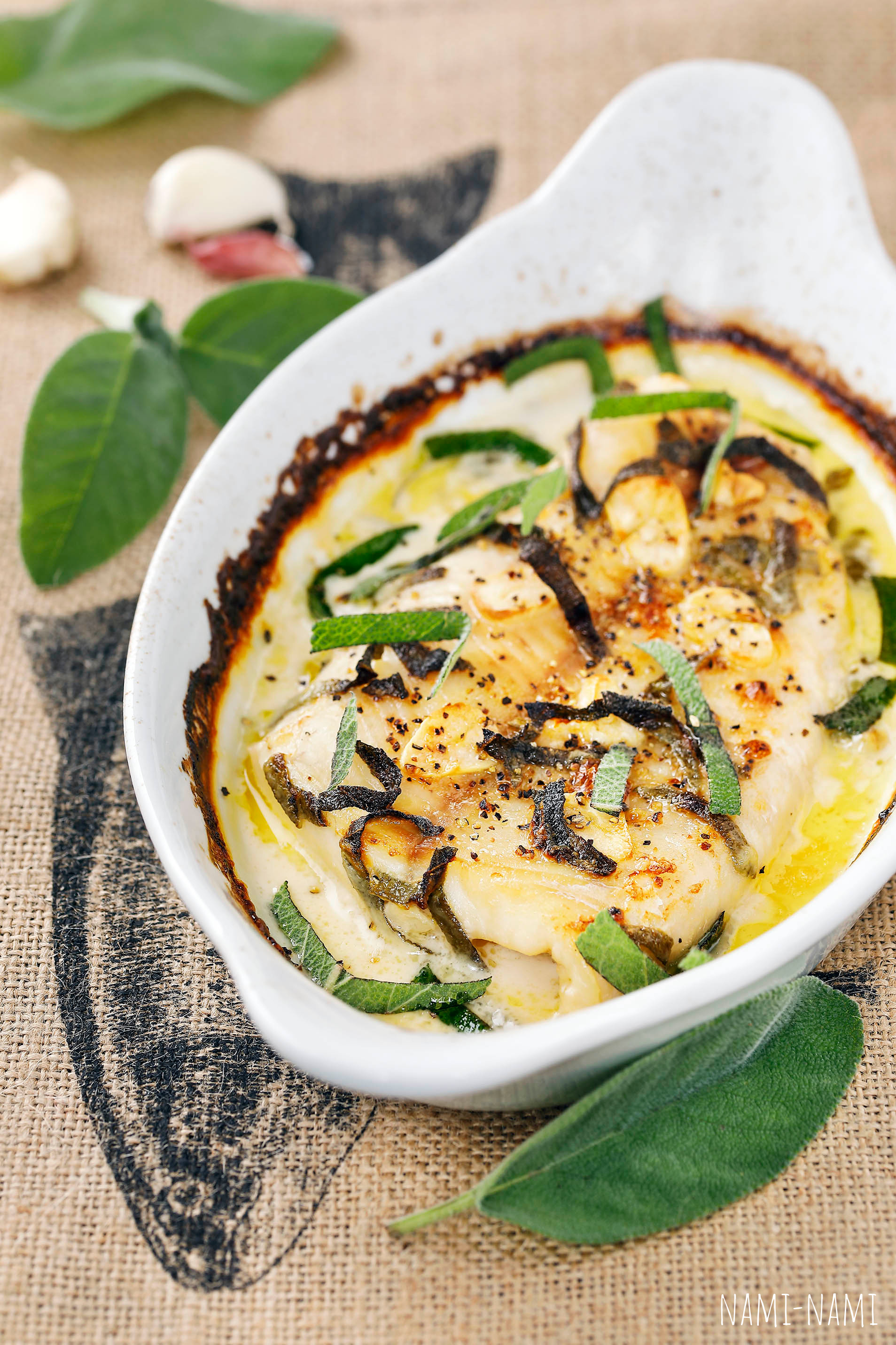 Maitsesta kalafileed soola ja pipraga ning aseta ahjuvormi. Puista peale küüslauguviilud ja hakitud salvei. Kalla peale rõõsk koor ja vein.