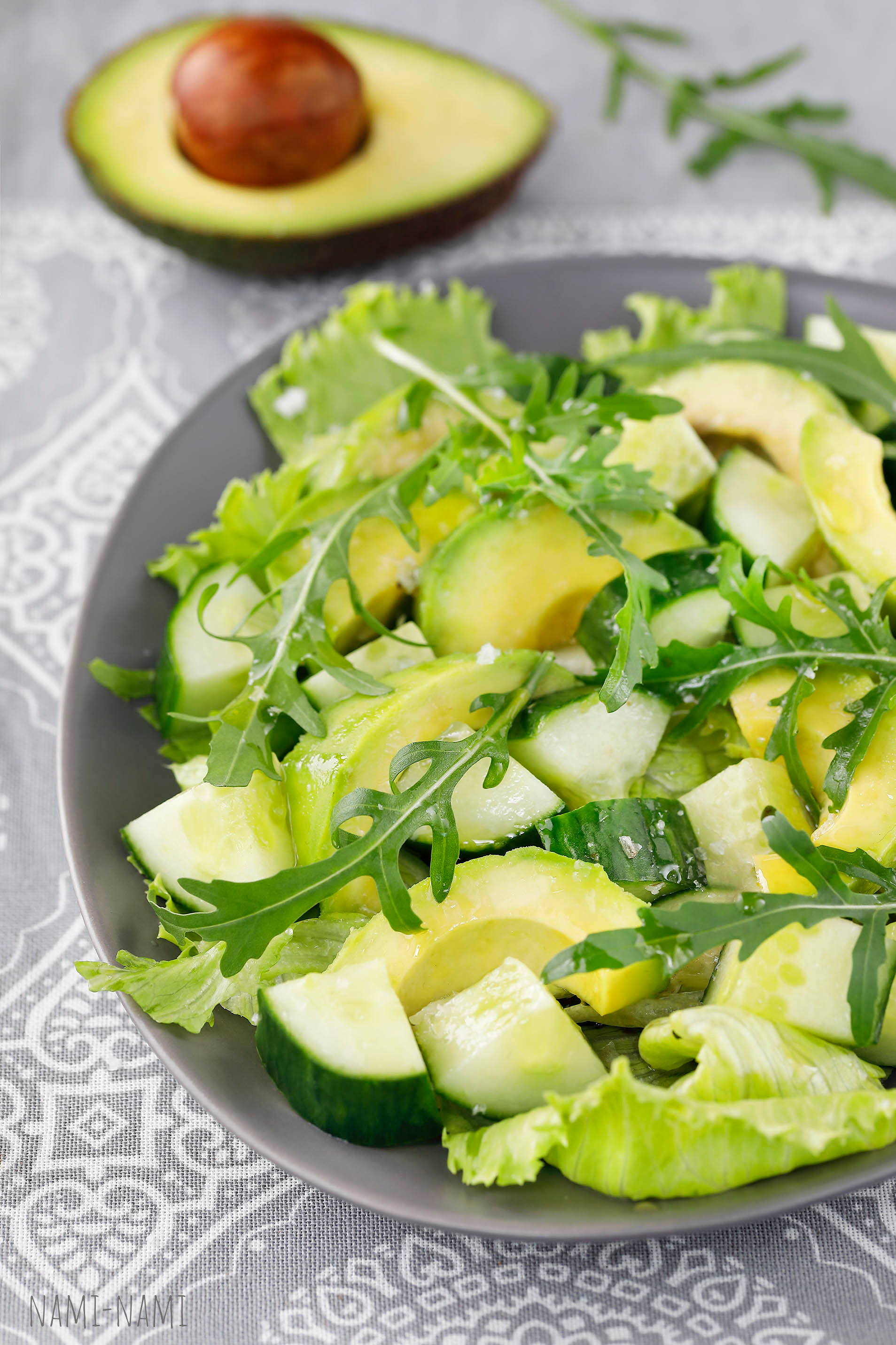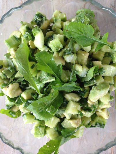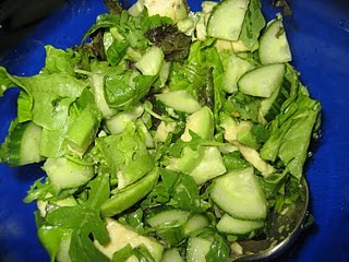 Pese salatilehed ja kurk. Rebi salatilehed väiksemateks tükkideks, lõika kurk kuubikuteks.