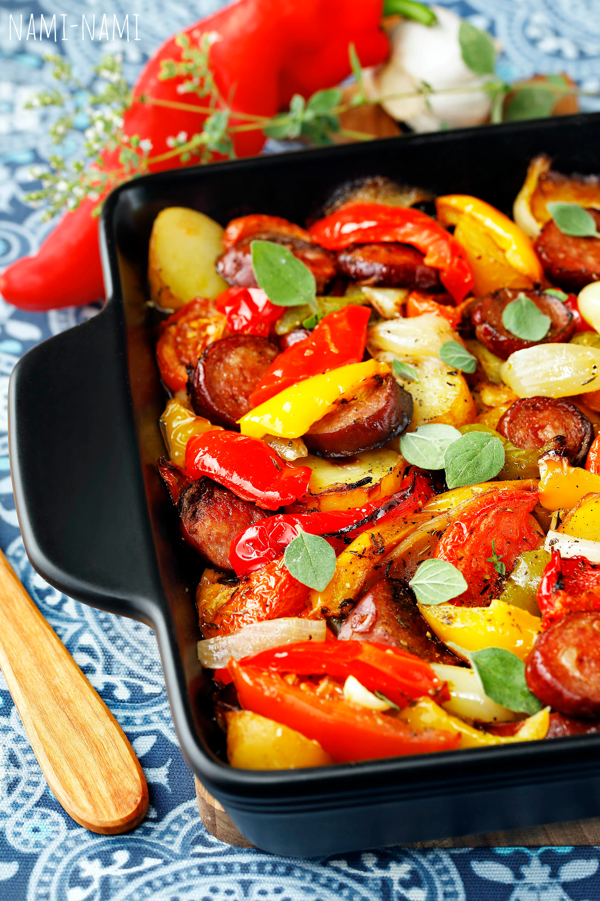 Poolita paprikad, eemalda seemned ning tükelda paprikad. Lõika tomatid ja sibulad sektoriteks, vorstid juppideks ning poolita kooritud kartulid. Lõika küüslauguküüned viiludeks.