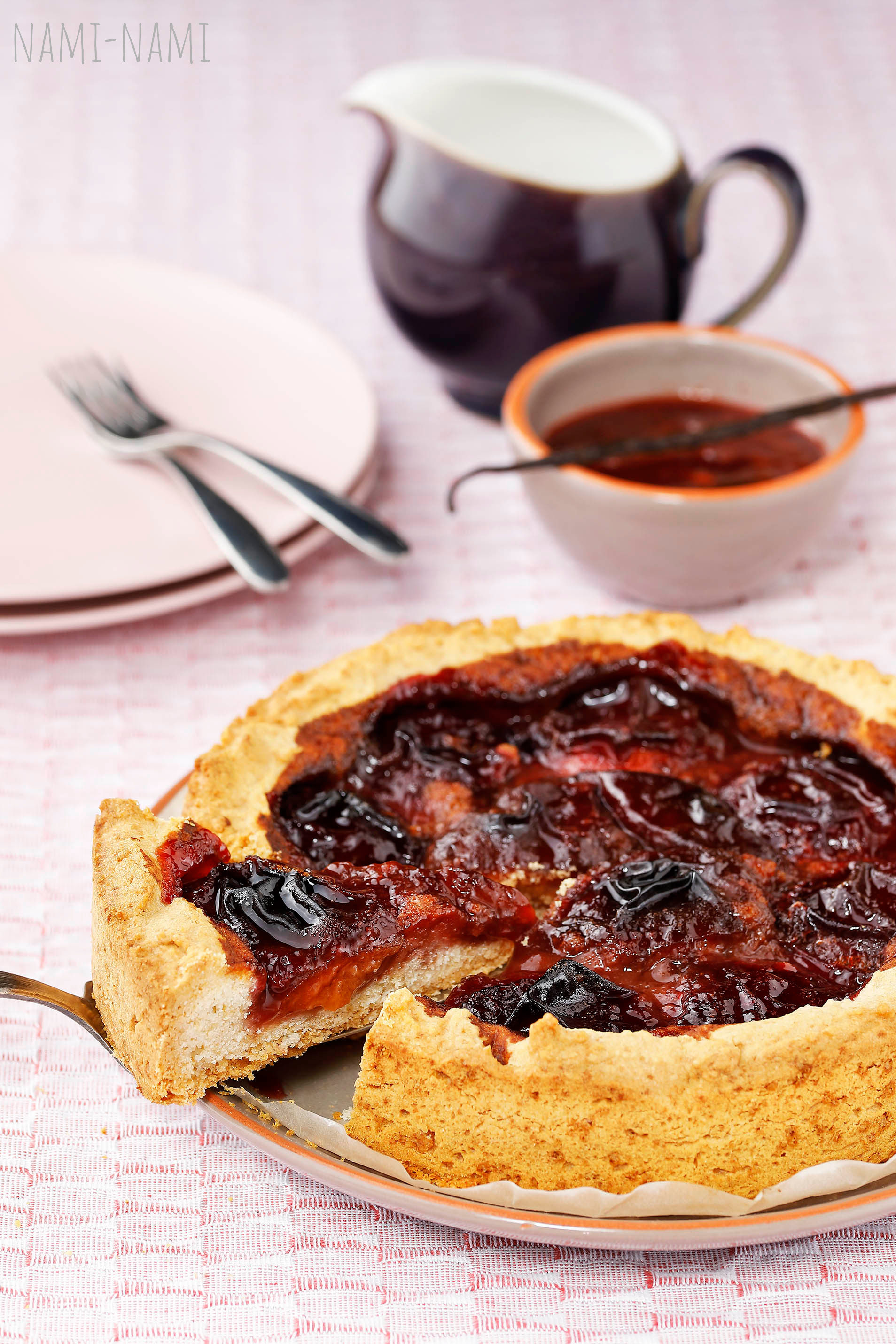 Rummi ja vanilliga maitsestatud ploomidega kaetud kook.
