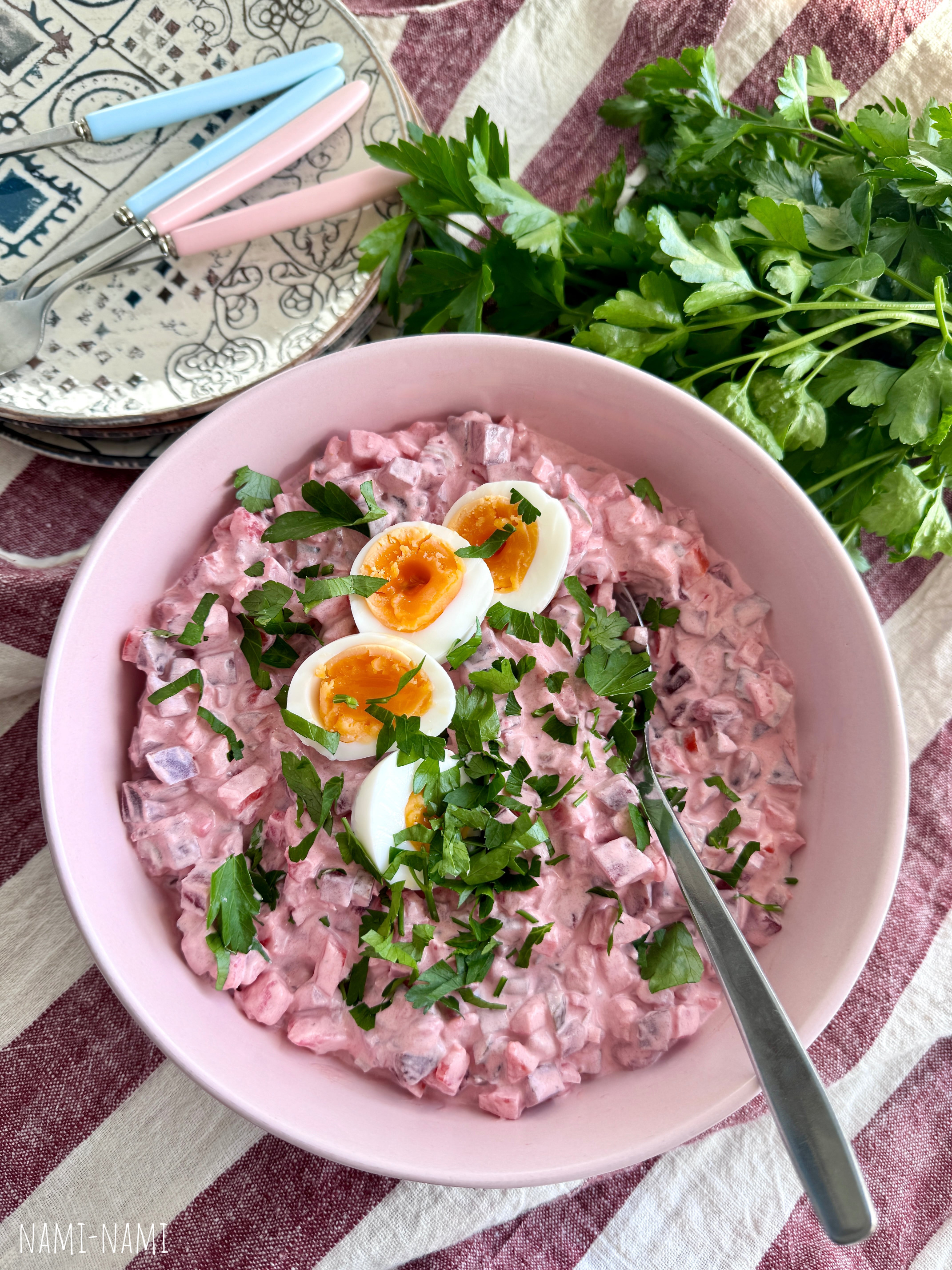 Sega suures kausis kartuli-, porgandi- ja peedikuubikud. Lisa hakitud sibul, hapukurk ja heeringas. Sega hoolega.