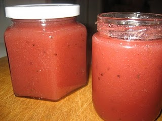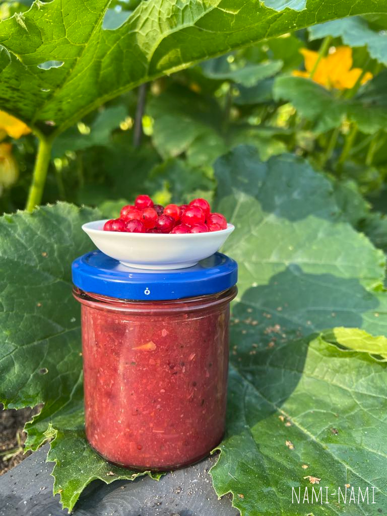 Soome MTV3 retsept (Kesäkurpitsa-punaherukkahillo/sose). Pildi tegi Nami-Nami perenaine Pille Petersoo, see on püreestatud versioon ja marju-suvikõrvitsat on umbes pooleks (900 g sõstraid, 1100 g suvikõrvitsat).