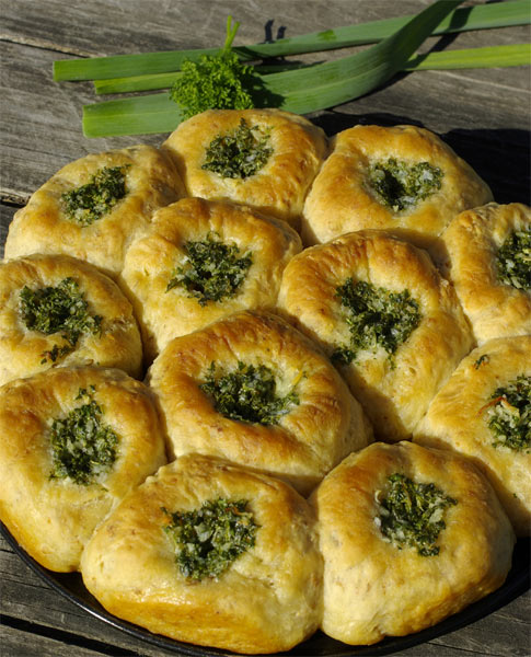 Samal ajal riivi või ja sega hakitud küüslaugu ja peterselliga ühtlaseks. (Või kasuta karulauguvõid või koduaia ürtidega võid). Vormi võist 12 pallikest. Vajuta jahuse pöidlaga iga kukli keskele süvend, pista sinna küüslauguvõi.