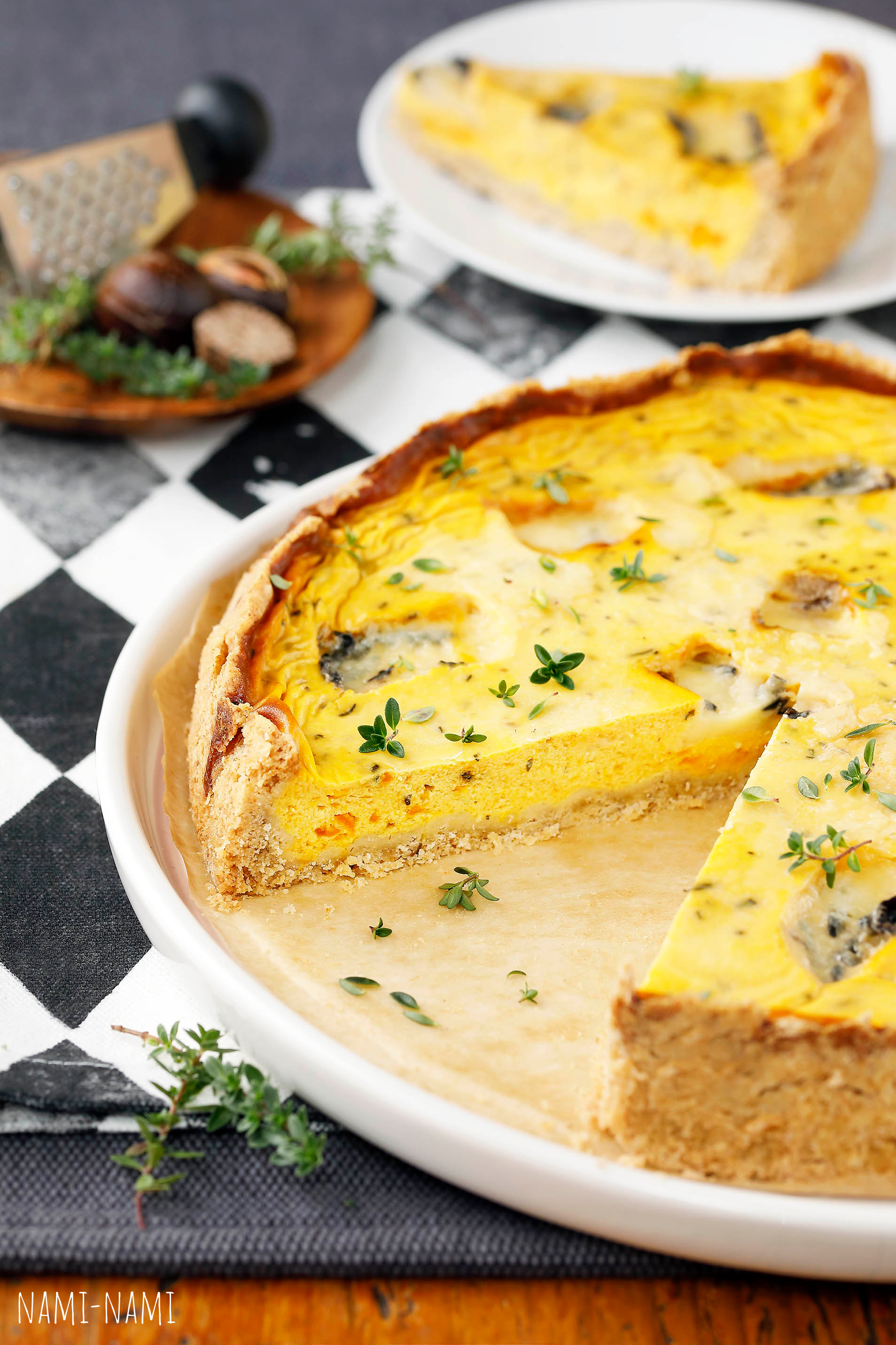 Muretainapõhjal soolane pirukas (quiche), millele annab magusust röstitud kõrvits ning pikantsust sinihallitusjuust.