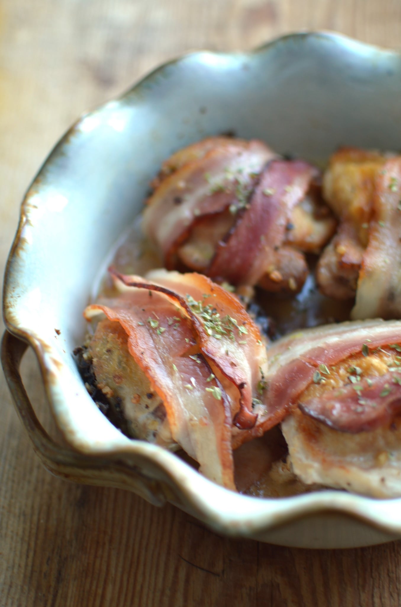 Aseta kanafileed töölauale ning tee terava väikese noaga külje peale sisselõige - saad nn 'tasku'. Vormi haggisest 2 piklikku vorstikest ning suru need kanataskutesse. Maitsesta kanafileed soola ja pipraga, keera peekoniribadesse.
