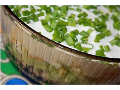 Klopi salatiained hästi läbi ning vala kihiti kaussi pandud tükeldatud ainetele.