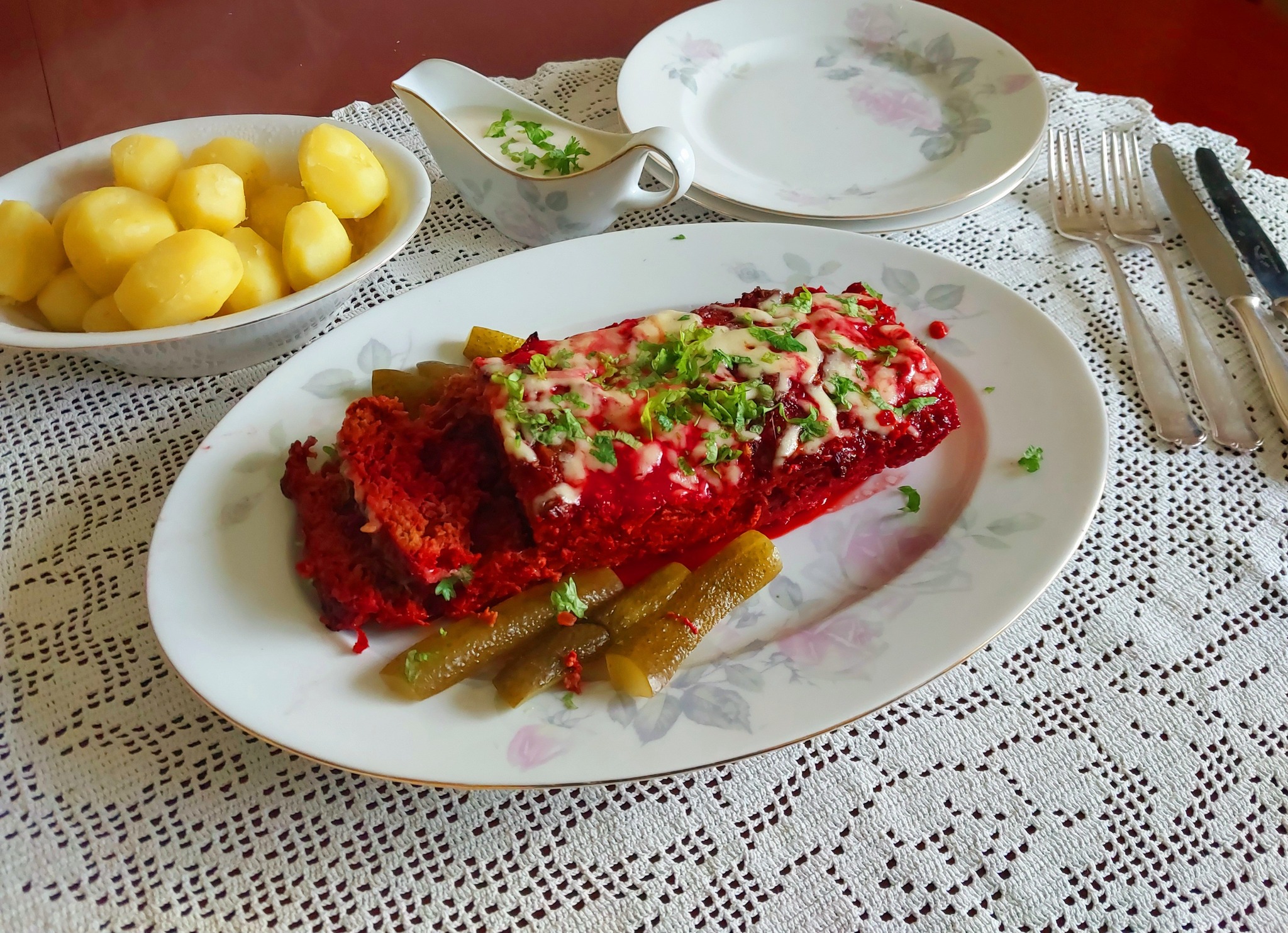 Sega kausis riivitud keedetud peet, hakkliha, peenelt hakitud sibul, riivsai, muna ja maitseained. Sõtku tainas ühtlaseks.