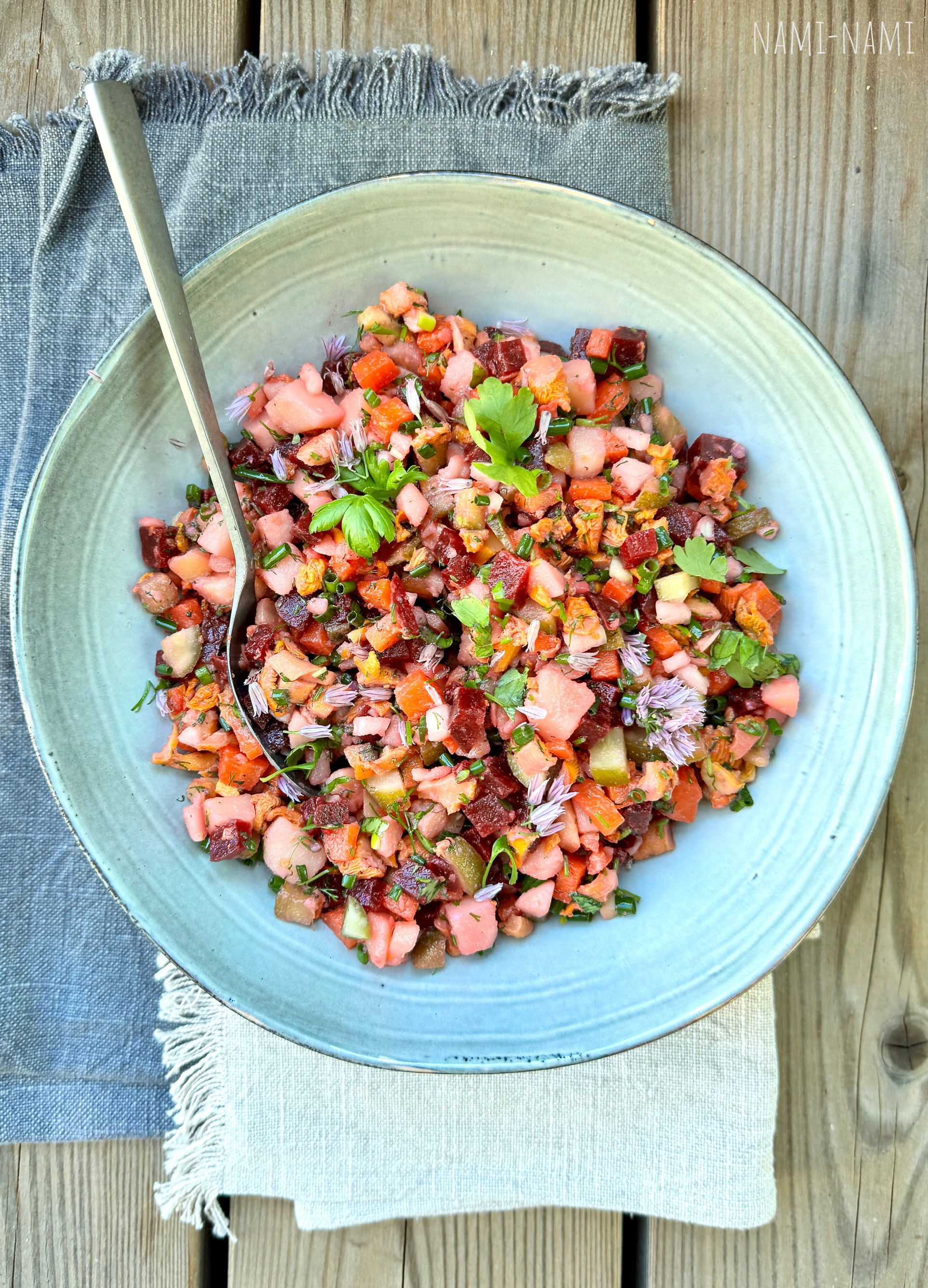 Haki seened ja sibul. Lõika keedetud porgand, peet ja kartulid ning hapukurk kuubikuteks, sega seente ja sibulatega.