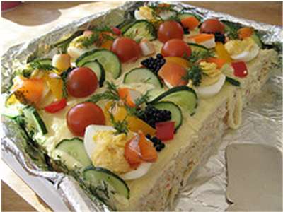 Kolmekihiline võileivatort sisaldab kahte erinevat täidist - üks kuumsuitsukalaga, teine surimiga. Mahlane ja maitsev.
