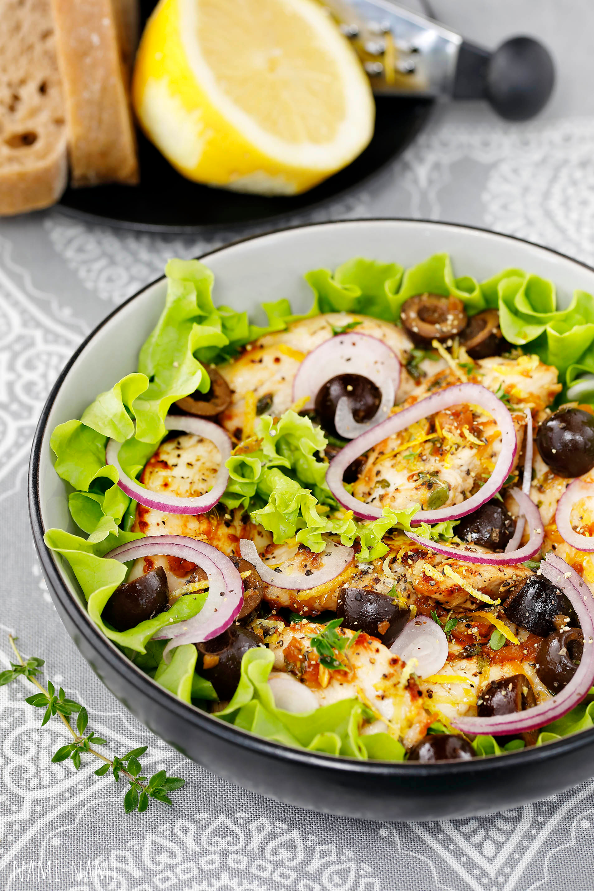 Tõsta salatilehtedele praetud kanafileeribad ning poolitatud oliivid.