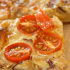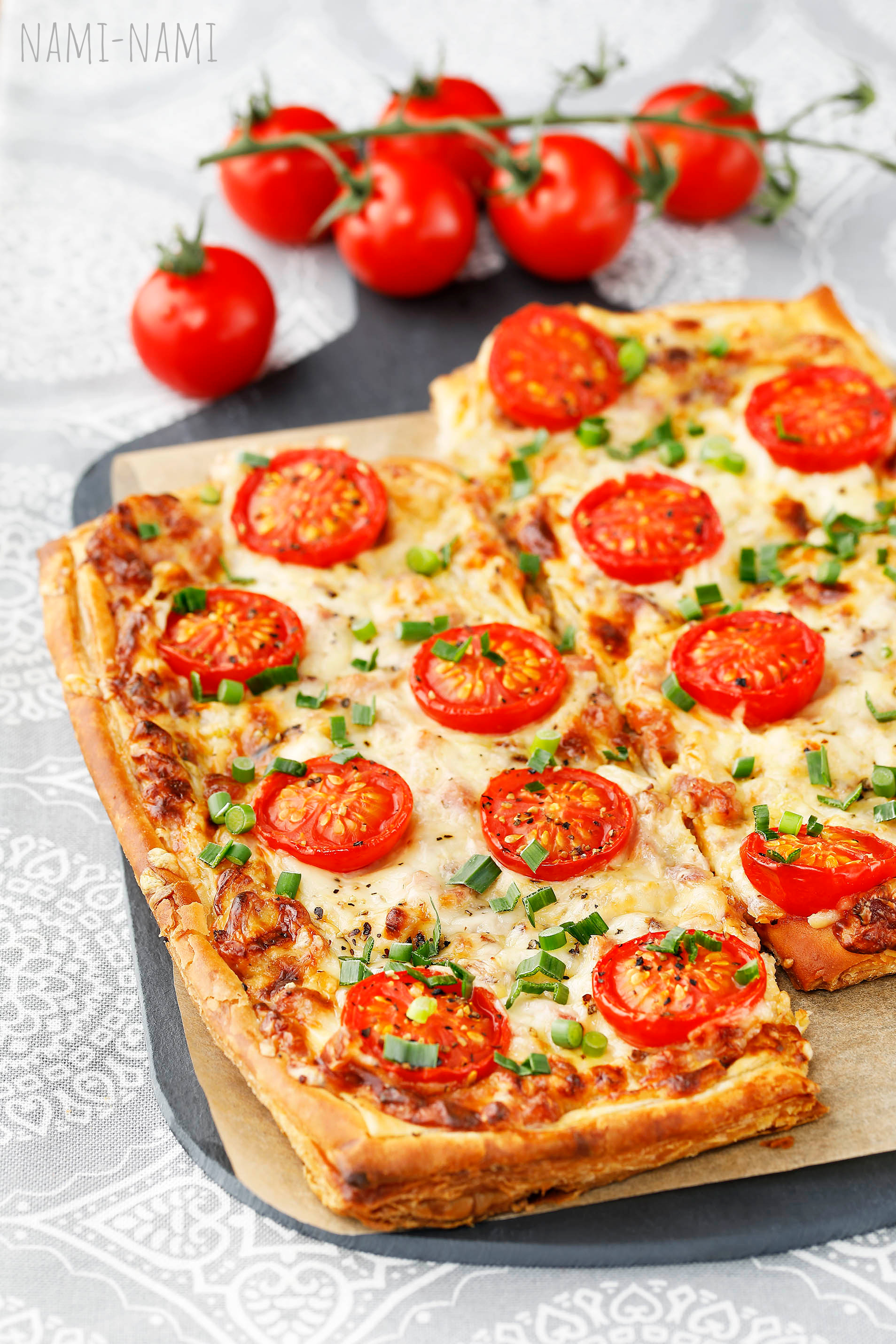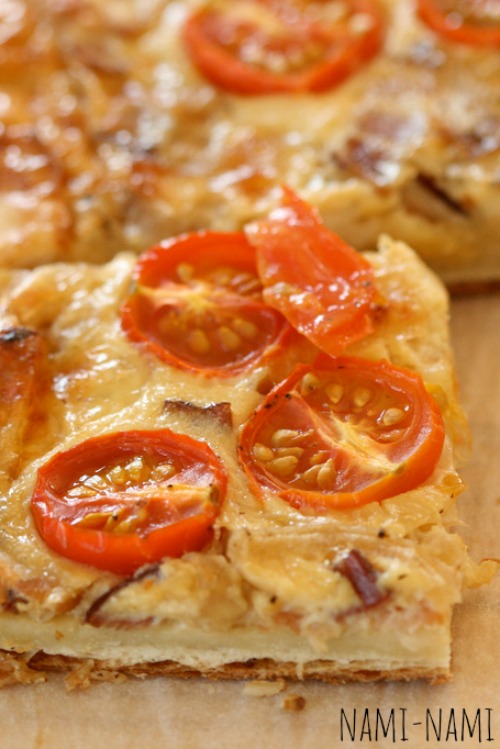 Lehttainapirukas suitsupeekoni, riivitud juustu ja praetud sibulatega. Veidi värvi annavad kirsstomatid.