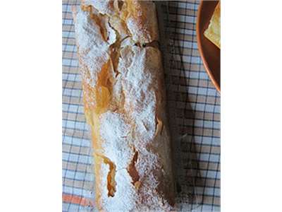 Filotainast valmistatud õunastruudel. Serveeri kuuma õunastruudlit koos jäätisega.