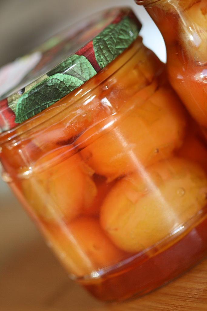 Keeda suhkrusiirup (kuumuta vesi keemiseni, lisa suhkur ja keeda 5-7 minutit), kalla purkidesse. Aseta kaaned purkidele, aga ära neid kinni keera.