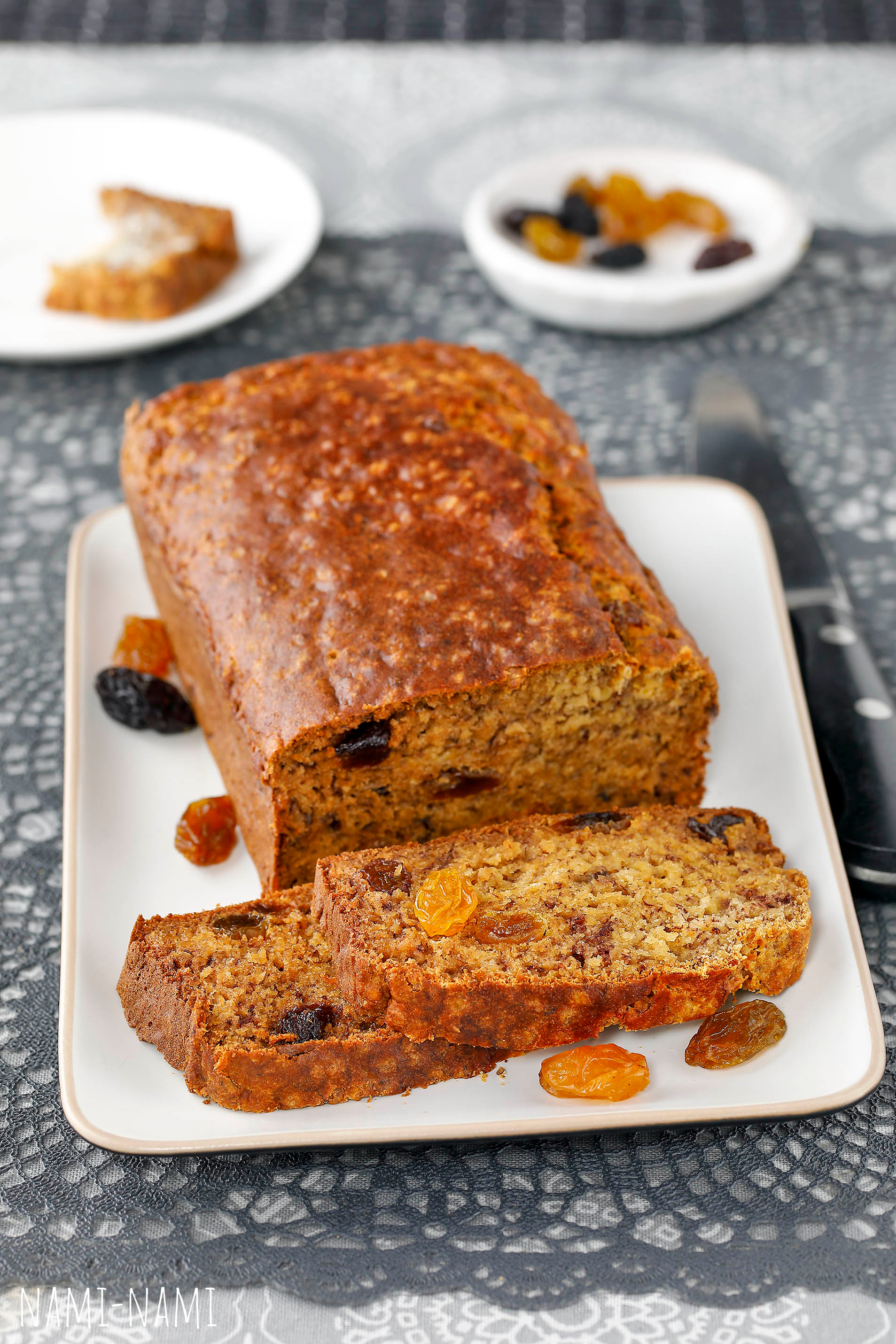 Tegin olude sunnil ilma banaanideta, suurendades aga või (125 g), jahu (3,5 dl) ja munade (3 tk) kogust. Rosinaid ei leotanud alkoholis. Tuli kohev ja laps ütles, et maailma parim keeks! :-)