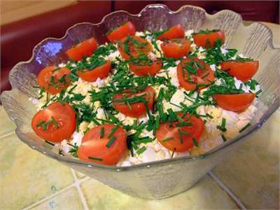 Kaunista salat hakitud murulaugu ning kirsstomatitega.