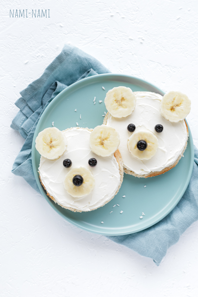 Jälgi banaani-maapähklivõisaia retsepti (vt siia), aga asenda maapähklivõi toorjuustu või kohupiimakreemiga. Jääkaru nina ja kõrvad saad banaaniviiludest, silmadeks ja ninaotsaks pane nt mustikad.