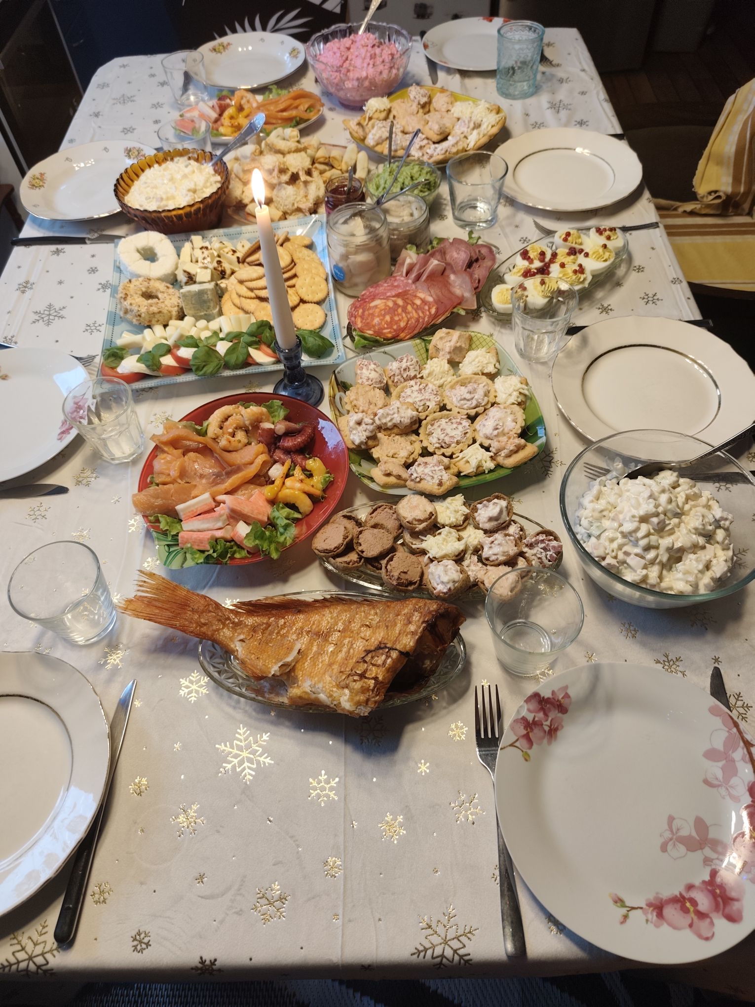 Karolin K: "Klassikaline, aga väksemas mahus jõululaud. Kalamari ja rosolje jäävad uut jõulu ootama. Magustoitu jõululaual pole, seega nüüd teen teie retsepti järgi beseerulli. Vaarikate asemel mõni pohl ning mandariini (konserv)"